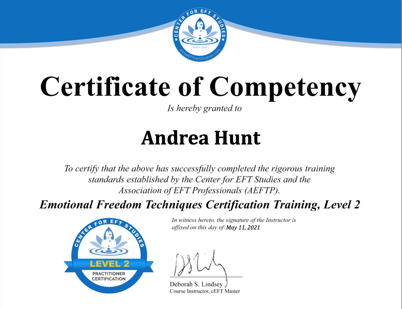 Andrea Hunt received her diploma in transformational life coaching from Animas Centre for Coaching UK and am an EFT Practitioner and a member of the Association for EFT Professionals