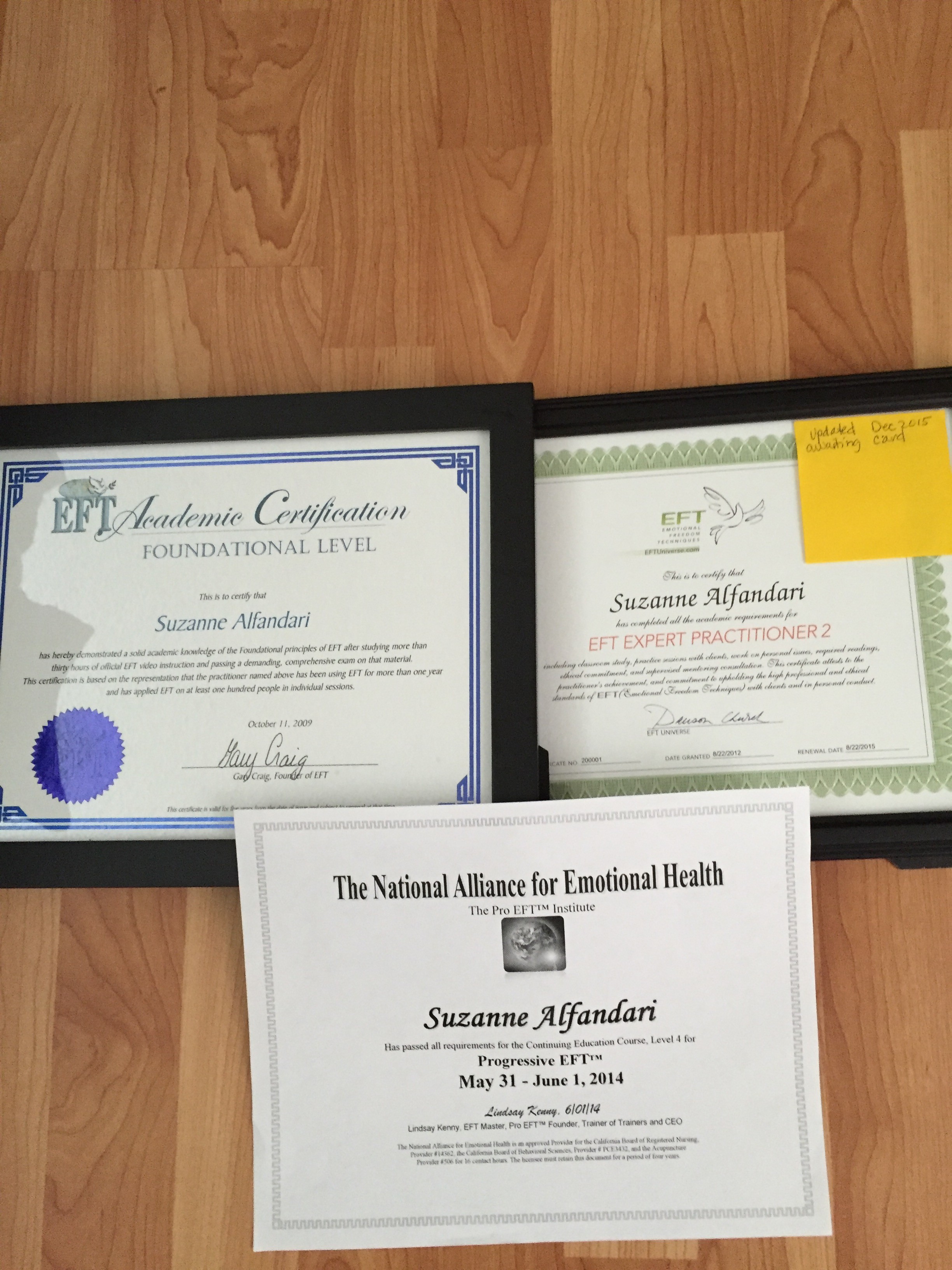 California Licensed Marriage and Family Therapist (MFC #36334), 2000 - present; Contributing author to the book, Clinical EFT Handbook: A Definitive Resource for Practitioners, Scholars, Clinicians, and Researchers. Vol. 1; EFT Universe Expert Practitioner 2, 2012 - present; Lindsay Kenney's Pro-EFT Level 4, 2014; Gary Craig's EFT Certification Foundational Level, 2009; Trained in Trauma Informed Care, Marin County Community Mental Health, 2013; Member of MINT, International Motivational Interviewing Network of Trainers, 2014 -present: 7-Advanced Workshops with Dr. Joe Dispenza, 2013 - present; Marin County Office of Emergency Services, Stress Manager, 2005- present.